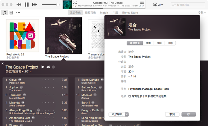 另外,关于唱片封面问题;如果欧美音乐比较多的话,登录欧美区账户,可自动匹配唱片封面(iTunes“偏好设置”中“商店”Tab下勾选“自动下载专辑插图”)或右键点击专辑,弹出菜单点击“获得专辑插图”。如果是中国区ID或者自定唱片封面;右键点选专辑,选择“显示简介”,把图片拖拽到对话框左上方的图片框内就可以了。