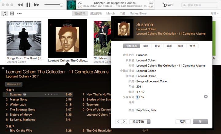 还可以把同一表演者的不同时期专辑统一在一个合集下,建立此表演者的作品全集(比如我有Lee "Scratch" Perry的近100张专辑,不敢直视),每张专辑按照年代顺序设置光盘编号,按照每张专辑名称命名每张专辑的“归类”,所有专辑命名为一个专辑名称;如“Leonard Cohen: The Collection”,最终会显示“Leonard Cohen: The Collection”的专辑下按照光盘号排列的同一表演者的12张不同年代的专辑。iTunes会把所包含的所有曲目移动到同一本地目录内。