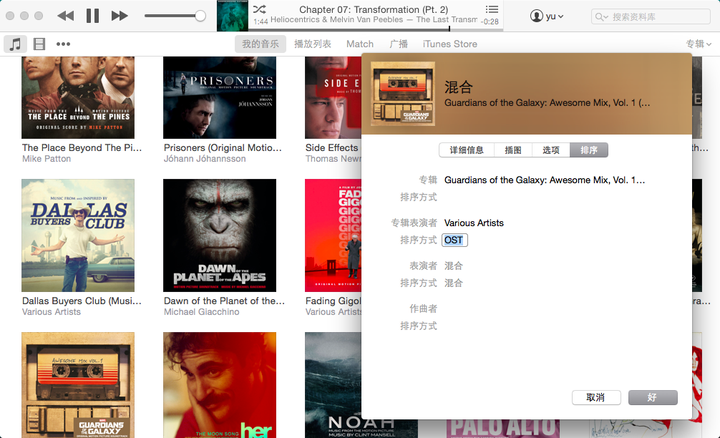 同样的方法,我把所有的电影原声按照表演者“OST”排序显示;在专辑视图上键入“O”,就会滚到这些专辑的视图位置。