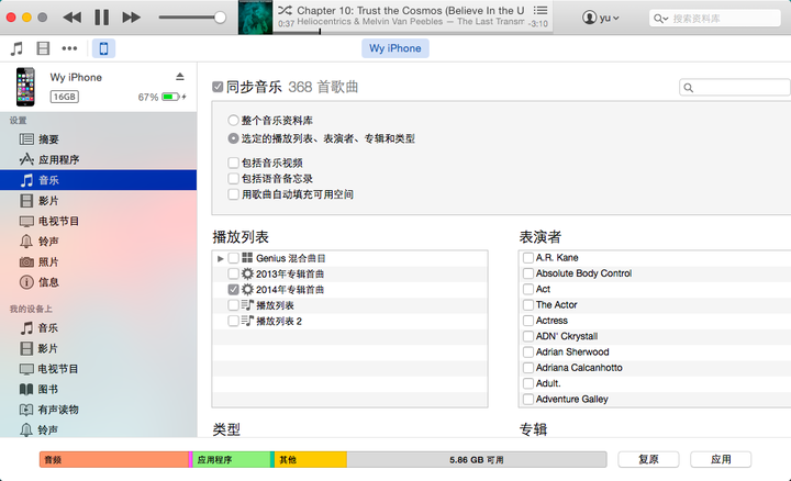 在同步设备的时候,勾选同步想要同步的播放列表就可以了,每次你都会觉得有新歌听(或者刻盘,送给哪个大姐),这是曲目多的好处。