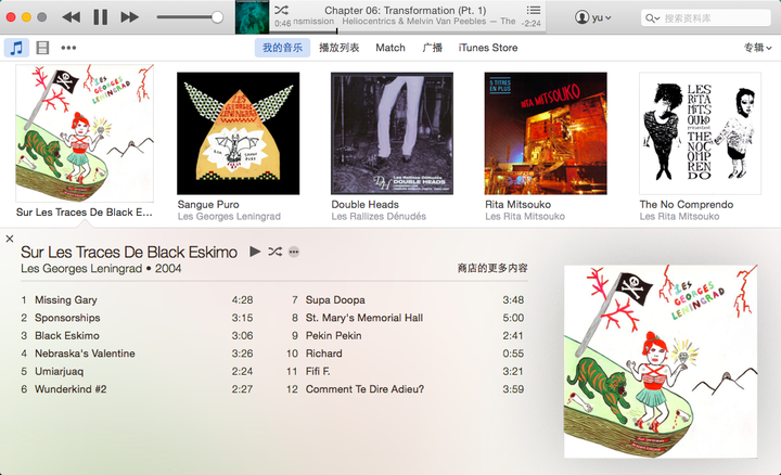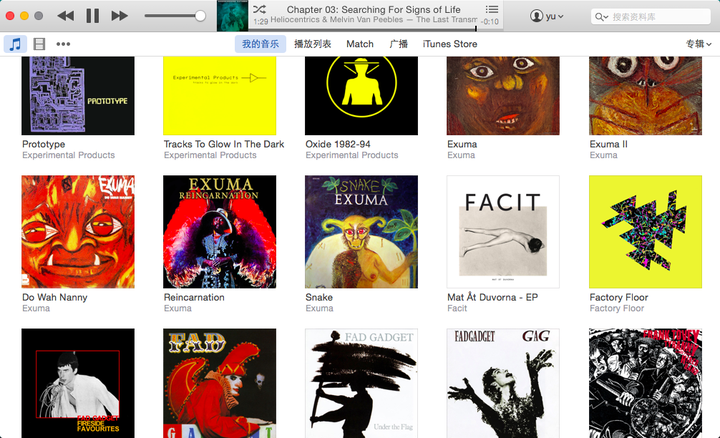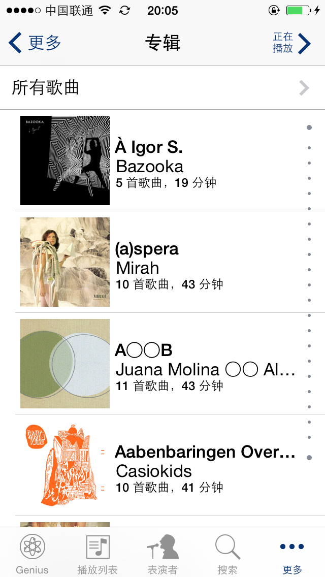 倒入的专辑有了表演者和专辑名字;那么在专辑视图上键入“L”视图会跳转到以“L”开头的表演者,键入“les”就会更精确,当然也可以使用右上角的搜索框;什么方式都不如记住触动自己的音乐家名字。