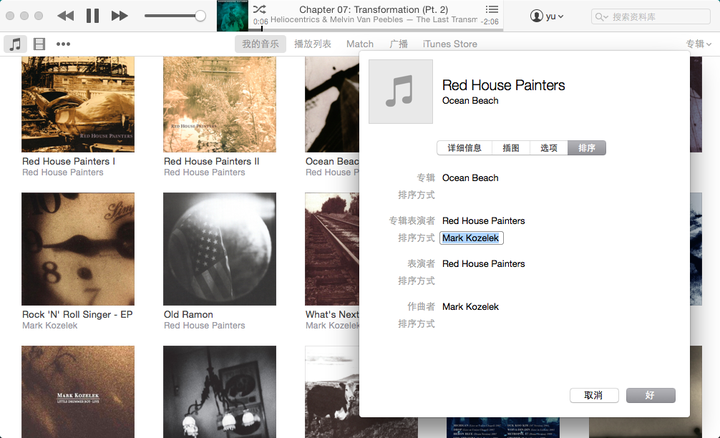 不同表演者也可以按个人习惯整合在以同一命名的索引下;以便于查找。如在”显示简介“的”排序“标签中;我把Red House Painters、Sun Kil Moon、Mark Kozelek三个不同表演者的所有专辑都按照同一表演者“Mark Kozelek”排序(因为它们都是Mark Kozelek的歌),那么在以“表演者”排序视图的时候,这些专辑都会排列表演者“M”的显示排序上,而不会按照“R”、“S”、“M”三个不同位置显示,且磁盘的文件目录不会被修改。