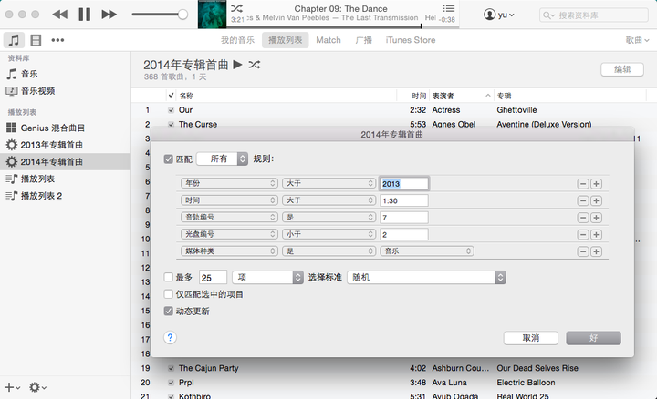 虽然是播放列表功能,但也是自动归类并播放的管理功能,如图,按自定义设置,智能播放列表会自动索引全部专辑中符合自定义的曲目并建立列表。你可以筛选曲目数量、年代、风格流派、动态更新,可以完全按照自己想要的。
