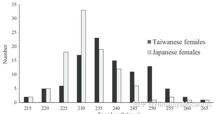 除此之外,日本的一项研究表明:台湾女性的足部大小显著高于日本女性,而中国台湾还是平均身高较低的省份,大陆这边数据估计只高不低。