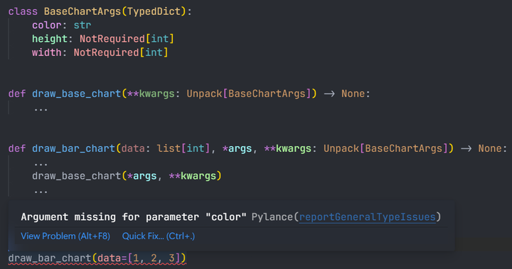 回到开头的话题吧,我们该如何给 **kwargs 正确标上类型?有了 TypedDict 的知识,或许你会这么想:
