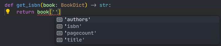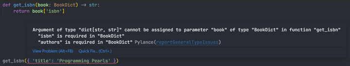 authors='Jon Bentley', pagecount=256)注意到这里 authors 期待接受一个字符串数组,却传入了一个字符串,Python 运行时也不会报错。这里顺便也展示了下 TypedDict 的另一种实例化方法。