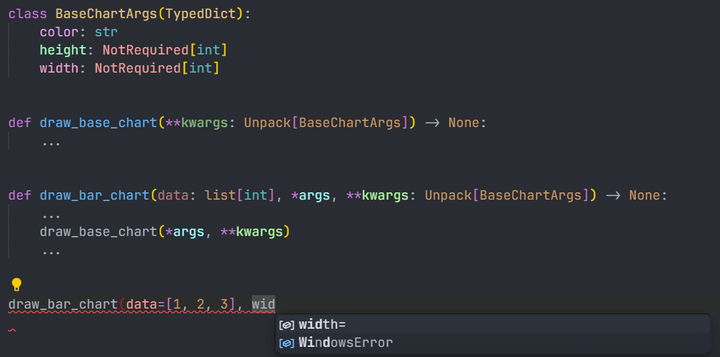 ...这两个 *args 和 **kwargs 可以说是直接把 Type Hints 给干碎了!你在编辑器里也没法从这东西里获得任何提示: