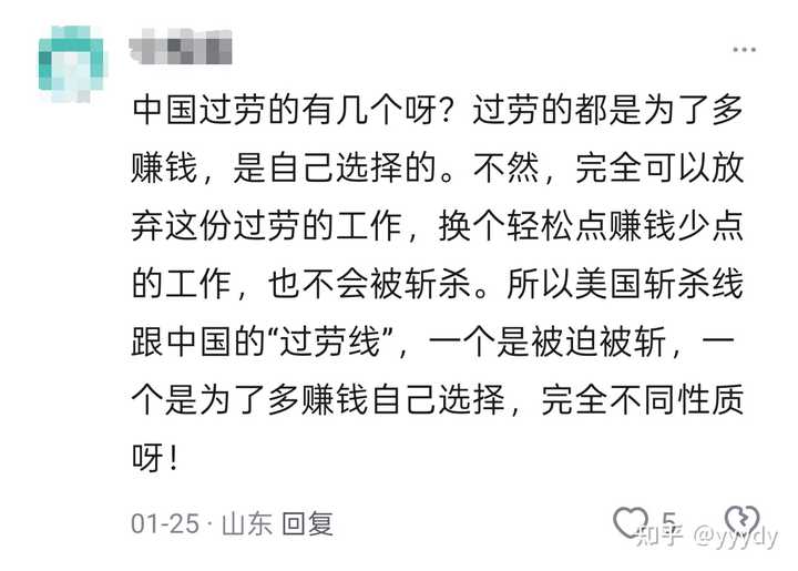 标本档案 A: “中国过劳的有几个呀?过劳的都是为了多赚钱,是自己选择的。不然,完全可以放弃这份过劳的工作,换个轻松点赚钱少点的工作,也不会被斩杀。所以美国斩杀线跟中国的‘过劳线’,一个是将被迫被斩,一个是为了多赚钱自己选择,完全不同性质呀!”