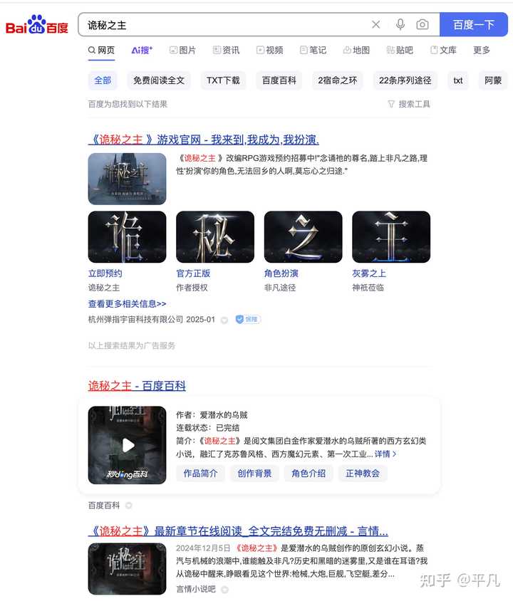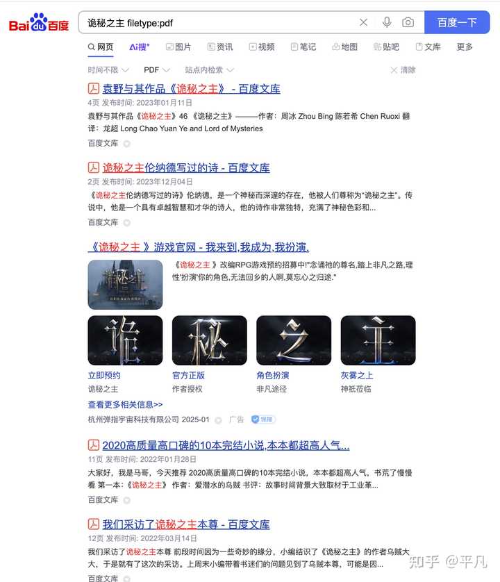 但是变成「诡秘之主 filetype:pdf」,展现出来的就没广告了,基本上都是相关的内容了。