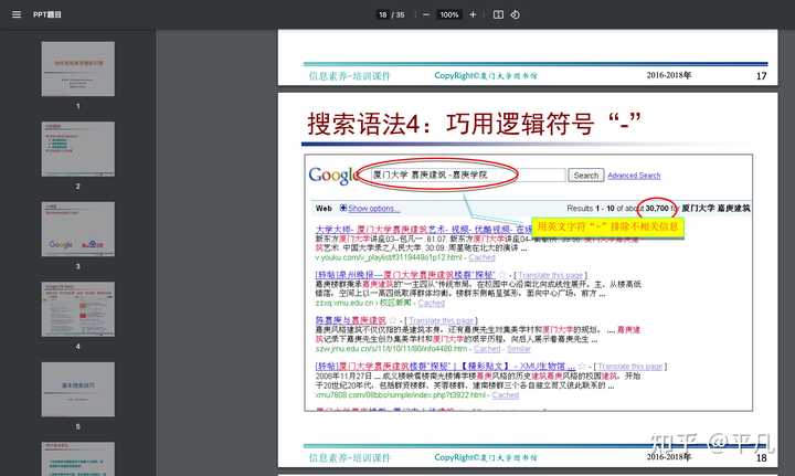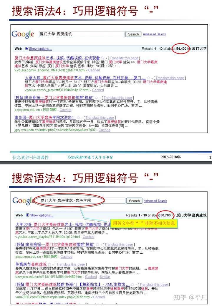 比如厦门大学图书馆的这份培训课件,讲的就是如何用“-”这个符号进行高阶搜索,它的作用就是从搜索结果中排除到不想关的信息。
