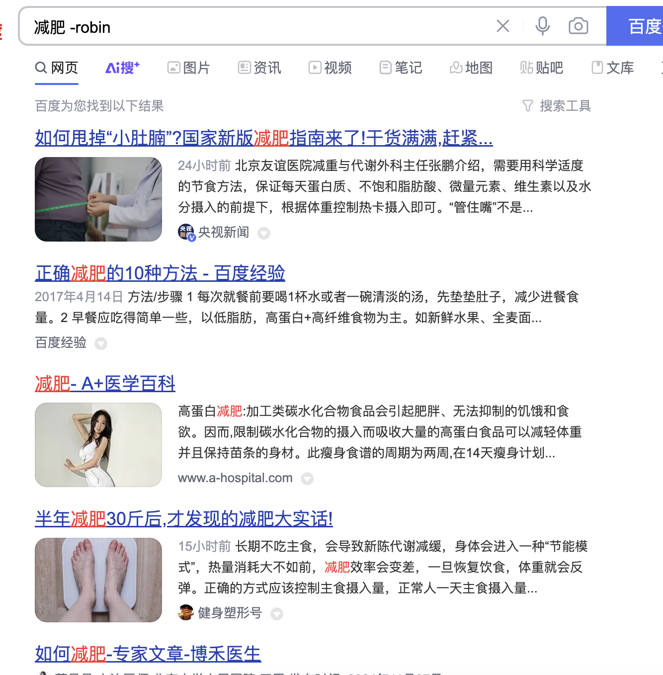| - (减号) | 排除包含某个关键词的结果 | AI -李彦宏 排除李彦宏相关结果 |